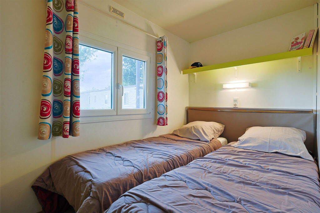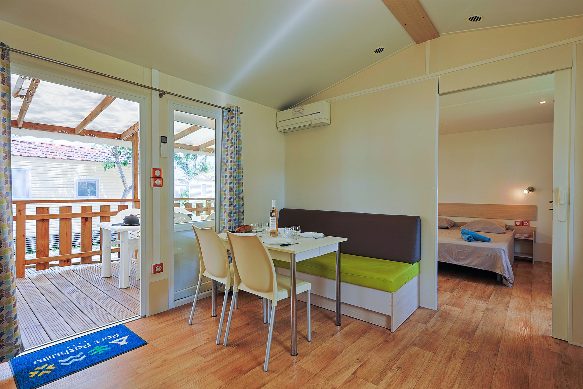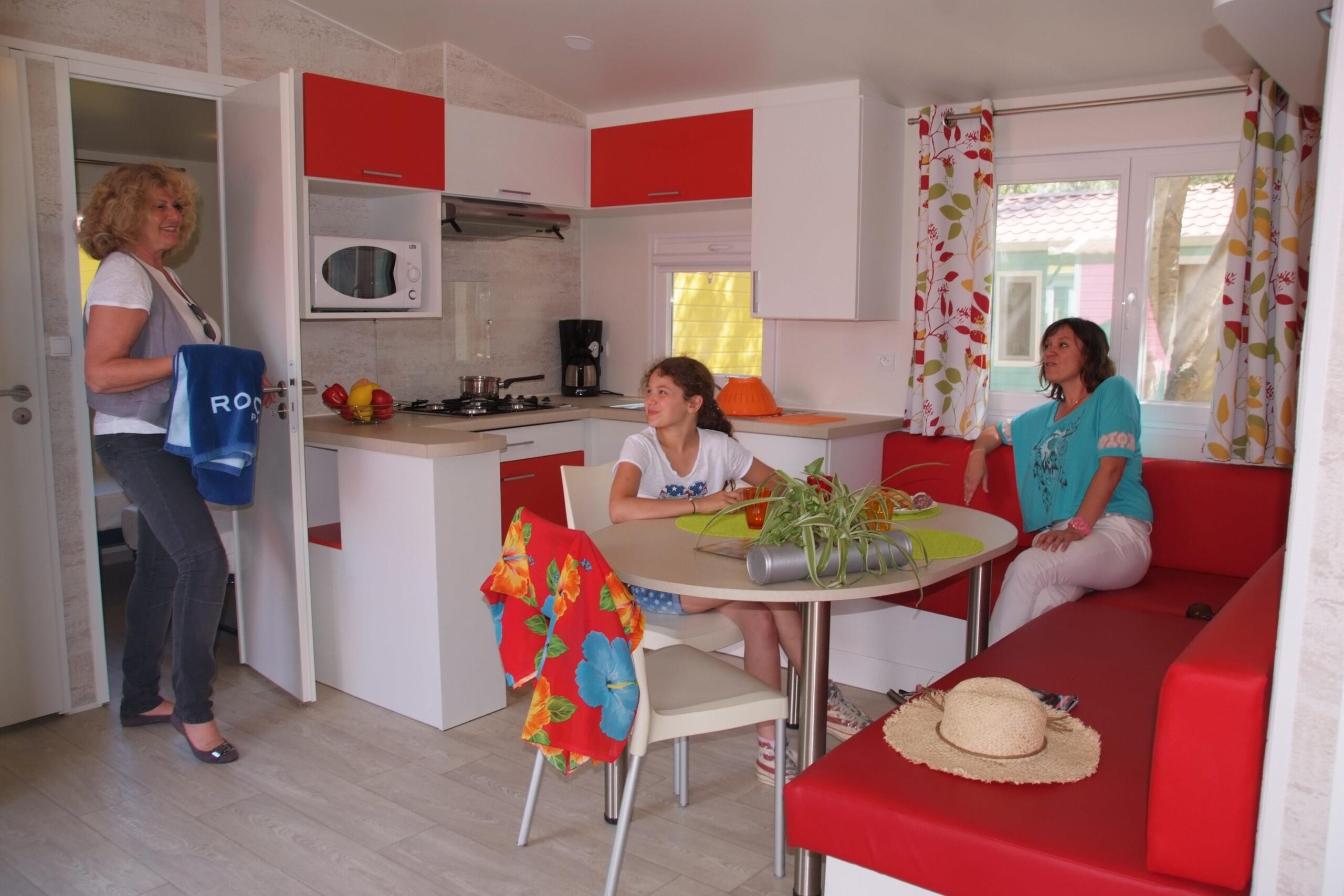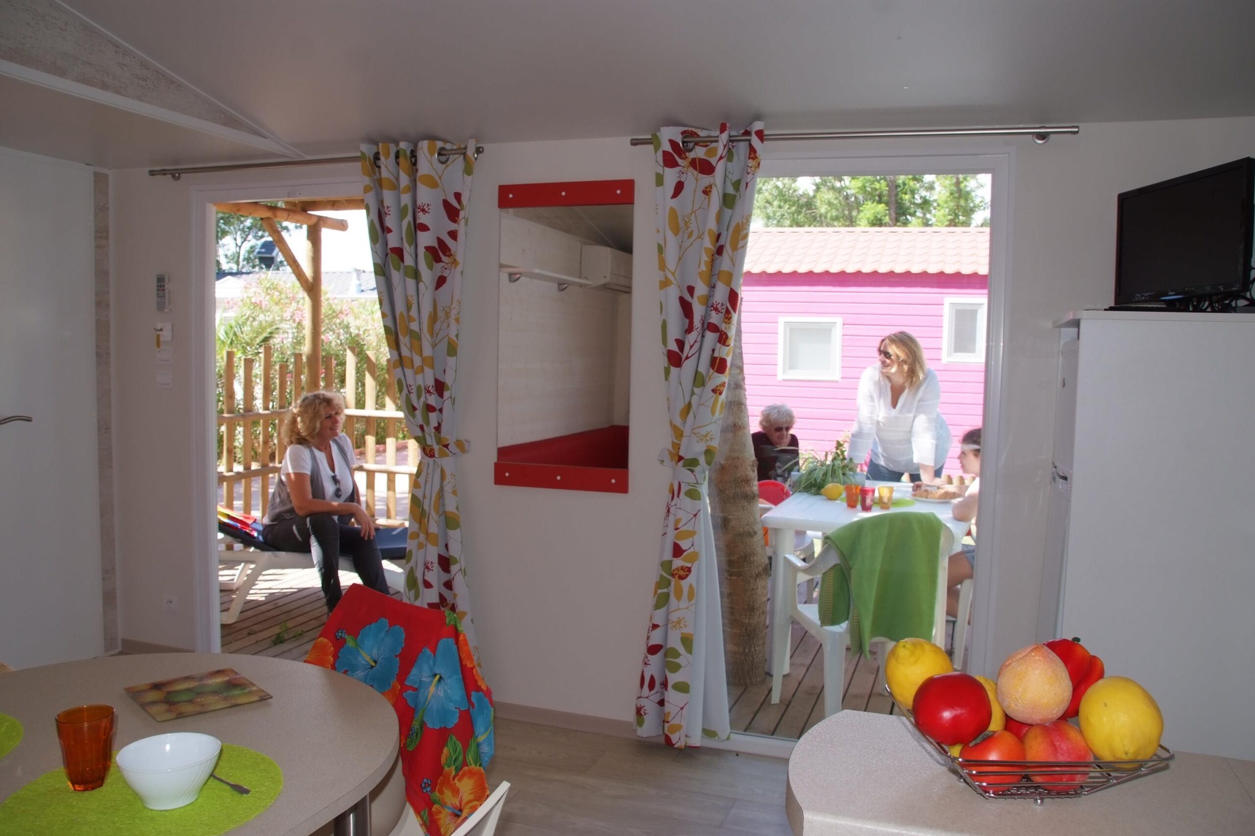 Residence 30 m² optioneel air. 2 kamers: een kamer met een bed van 140 cm of 160 x 190 cm (afhankelijk van beschikbaarheid), 1 kamer met 2 bedden 80 cm x 190 cm + omgezet in een lounge bed slaapt twee. Elektrische verwarming, tv, kluis, magnetron, gasfornuis, koffiezetapparaat, koelkast met vriesvak, douche en toilet apart. Pergola met tuinmeubelen en ligbedden. een voertuig.