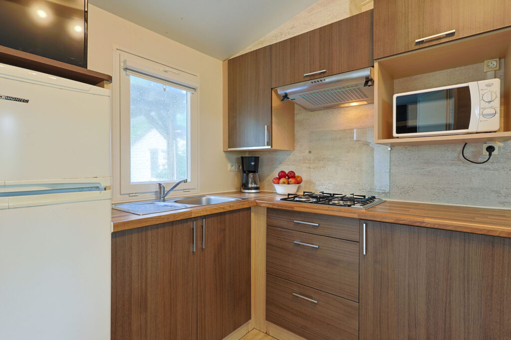 Stacaravan 17m ². 2 kamers: 1 kamer met 1 bed van 140 cm x 190 cm, 1 kamer met 2 bedden van 70 cm x 190 cm. Elektrische verwarming afhankelijk van het model (vraag in het seizoen). Koud water op het aanrecht, fornuis, koffiezetapparaat, koelkast. Terras met pergola en tuinmeubelen.